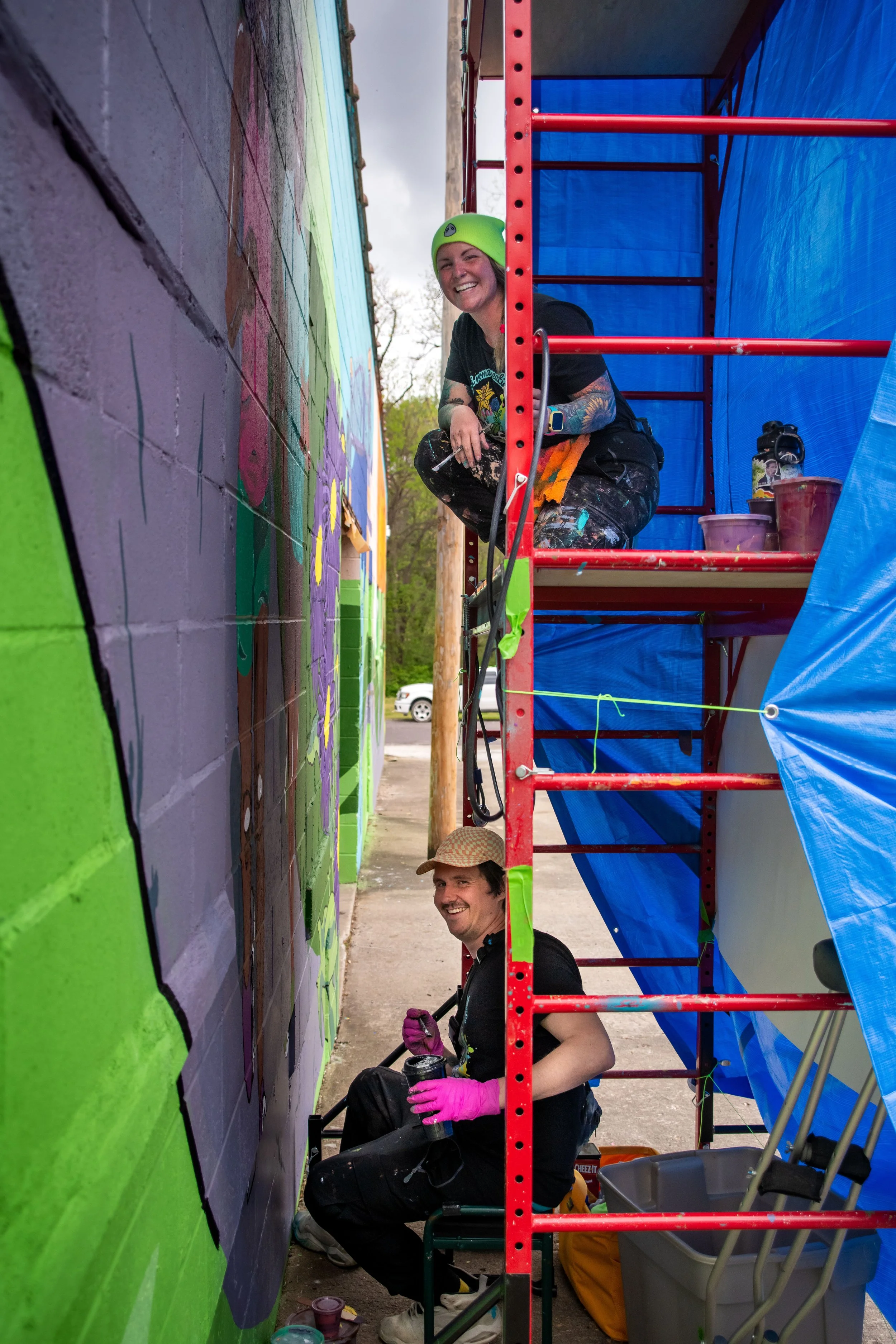 I had the best crew by my side. My mom and cousin showed up ready to work—with snacks, support, and serious stamina. My best friend, Laura King, brought the ultimate vibe: hilarious one-liners, perfectly timed jokes, and hands-down the best playlists (we’re talking dance breaks on the scaffolding kind of good). And of course, Tony Sanderford—my boyfriend, co-artist, and partner in paint. Tony is the kind of guy who can sketch a perfect train engine and solve a paint sprayer problem in under five minutes. We tag-teamed the whole thing, our hands always covered in color, often matching by accident, always working in sync. If murals had soundtracks, ours would be laughter, splattered paint, and a lot of “Wait, what if we add this?”
